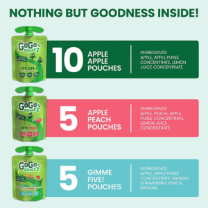 - Stock up on this variety pack of 20, 3.2 ounce GoGo squeeZ Fruit on the Go, (10) Apple Apple, (5) Apple Peach & (5) Gimme Five! unsweetened applesauce pouches, is kitchen pantry safe (no refrigeration required)